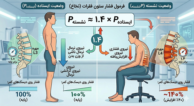 این موضوع بسیار مهم است که بدانیم، تأثیرات فیزیولوژیک و علمی ارگونومی بر بدن چگونه است. از منظر بیومکانیک، نشستن طولانی مدت فشار داخل دیسک «Intradiscal Pressure» را افزایش میدهد. بر اساس فرمولهای فیزیک بدن، فشار وارد بر مهرههای کمر در حالت نشسته بدون پشتی و حمایت، حدود ۱۴۰٪ بیشتر از حالت ایستاده است.